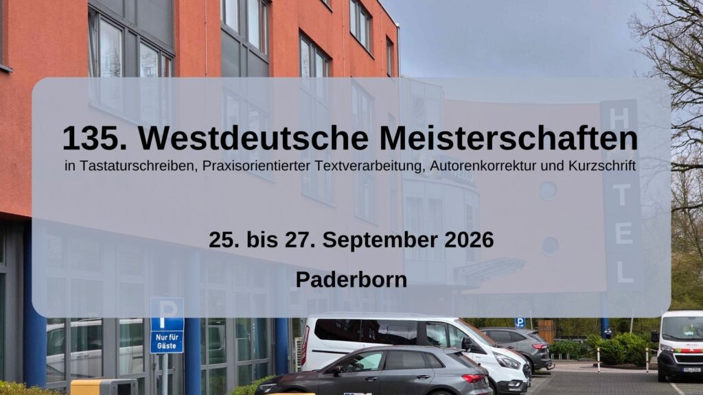 Der Verband für Informationsverarbeitung NRW e. V. lädt alle Mitglieder, Vereine und Interessierten herzlich zum Westdeutschen Stenografentag 2026 ein. Die Veranstaltung bildet wie in jedem Jahr den Rahmen für die Westdeutschen Meisterschaften in Tastaturschreiben, Praxisorientierter Textverarbeitung, Autorenkorrektur und Kurzschrift. Der Stenografentag geht 2026 in seine 135. Runde und ist ein fester Bestandteil der Verbandsarbeit in Nordrhein‑Westfalen.